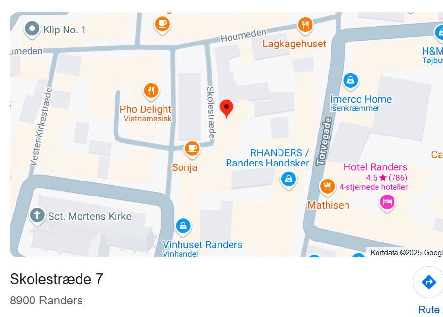 Find vej: Centret ligger i det smalle stræde lige bagved Helligåndshuset i Randers. Det er lige ved siden af Café Sonja og tæt på den store røde Sct. Mortens Kirke midt i Randers Centrum.
